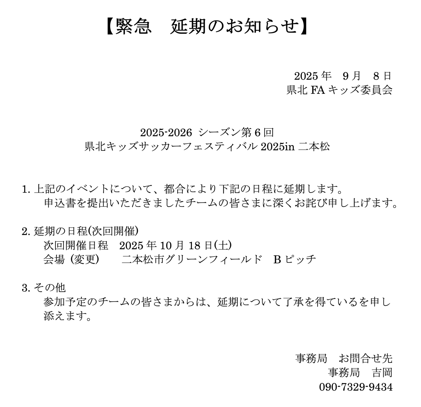 | 大会名 | 県北キッズサッカーフェスティバル2025in 二本松 |