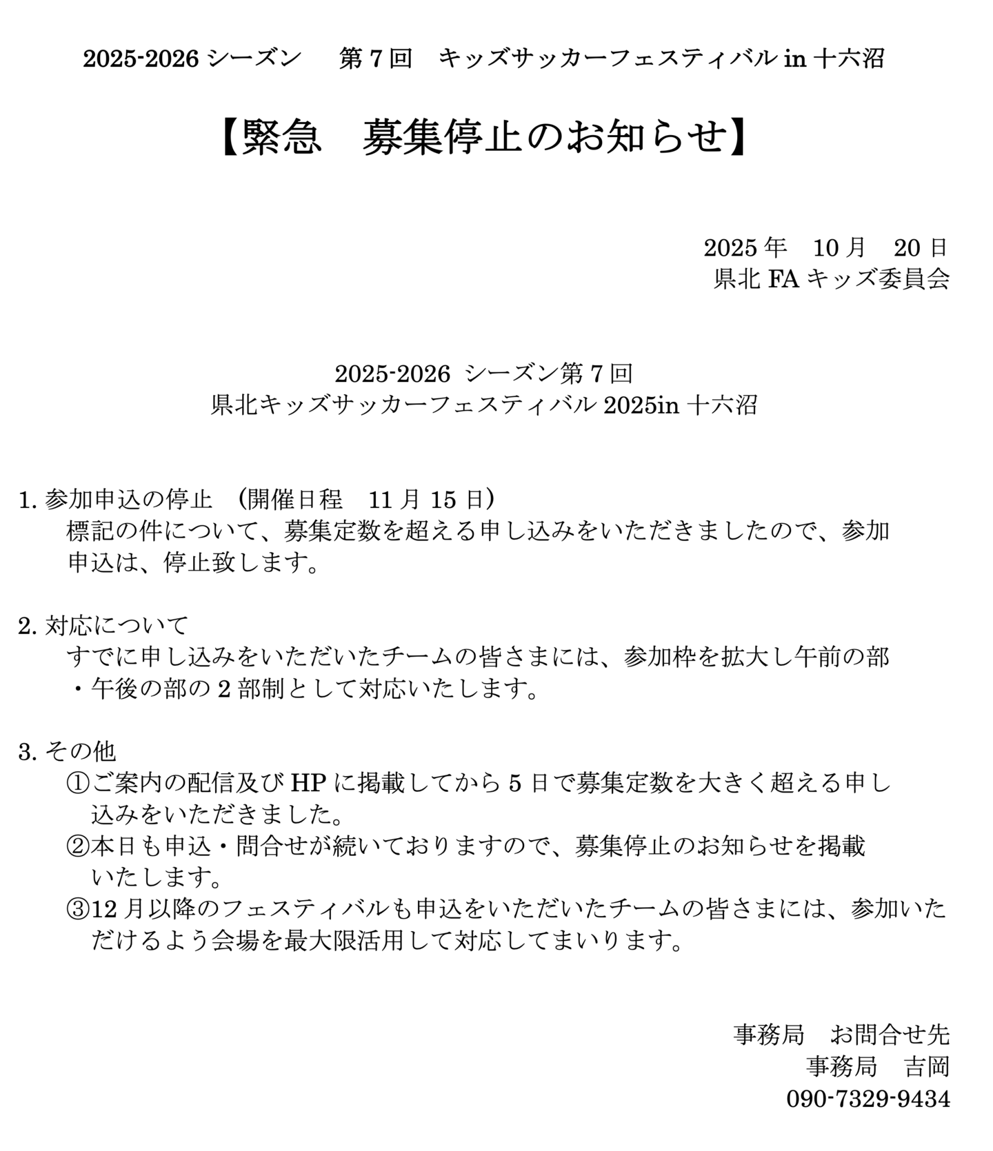 | 大会名 | 県北キッズサッカーフェスティバル2025in 十六沼 |
