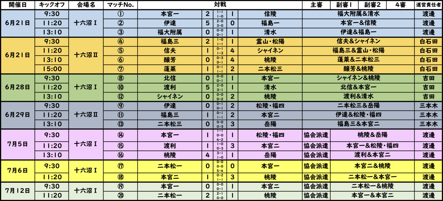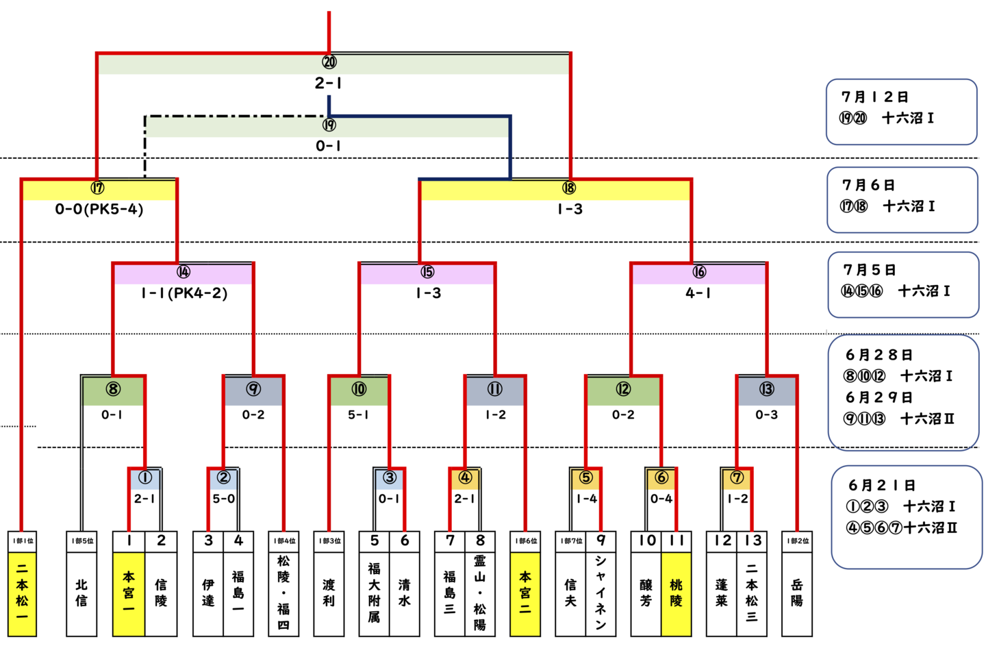 大会名 ろうきん杯争奪第36回 福島県U-15サッカー選手権県北大会 期 日 2025年6月21日(土)~7月13日(日) 会 場 十六沼公園 結果 第1代表 二本松一中第2代表 桃陵中第3代表 本宮二中第4代表 本宮一中 スケジュール 大会要項